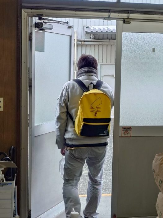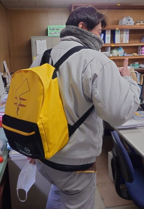 そんな動画の影響か…なんと!別の従業員から「これ、何かのネタにしてください」と、ネズミの方の黄色い人気者ピカ〇ュウモチーフのリュックが提供されました。